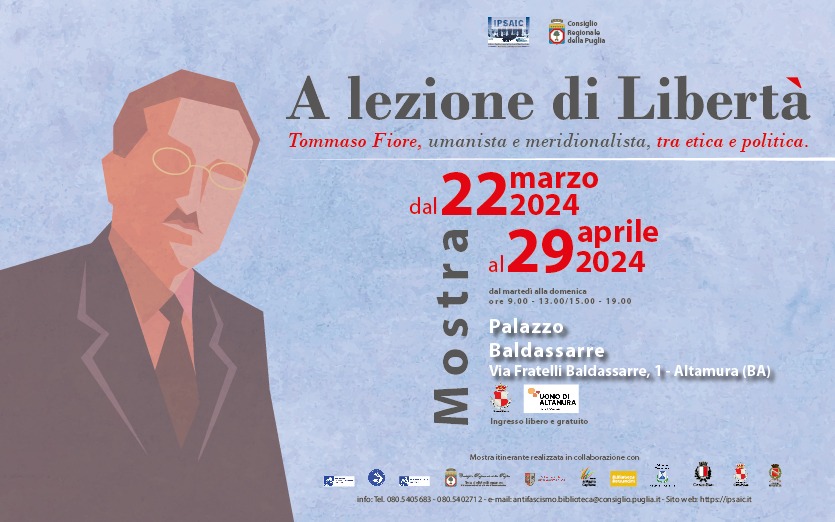 La mostra A lezione di libertà ad Altamura fino al 29 aprile 2024 Pubblicato il 22 Marzo 202422 Marzo 2024 di Ipsaic Si comunica che la mostra “A lezione di libertà” sarà visitabile presso il Palazzo Baldassarre di Altamura dal 22 marzo fino al 29 aprile 2024.