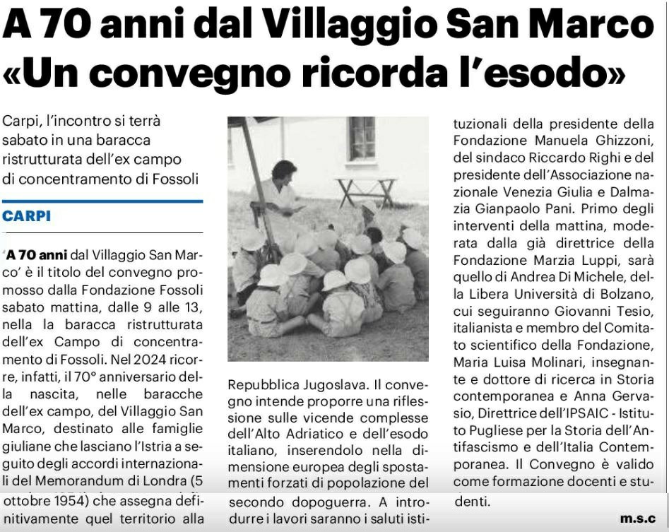 A 70 anni dal Villaggio San Marco’ è il titolo del convegno promosso dalla Fondazione Fossoli sabato mattina, dalle 9 alle 13, nella baracca ristrutturata dell’ex Campo di concentramento di Fossoli. Nel 2024 ricorre, infatti, il 70° anniversario della nascita, nelle baracche dell’ex campo, del Villaggio San Marco, destinato alle famiglie giuliane che lasciano l’Istria a seguito degli accordi internazionali del Memorandum di Londra (5 ottobre 1954) che assegna definitivamente quel territorio alla Repubblica Jugoslava.