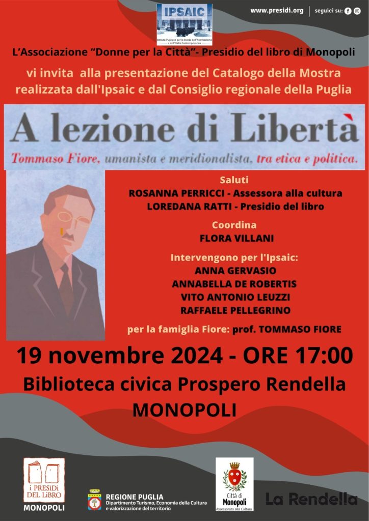 Continuano le iniziative relative alla mostra A lezione di libertà. Tommaso Fiore, umanista e meridionalista, tra etica e politica. Mentre la mostra è ancora fruibile ospite de Comune di Ruvo di Puglia presso Palazzo Caputi, si dialoga sul catalogo (Edizioni dal Sud, 2024) grazie all'Associazione donne per la città - presidio del libro presso il Comune di Monopoli, il 19 novembre 2024 ore 17.00 presso la Biblioteca civica Prospero Rendella.