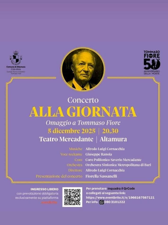Il prossimo 5 dicembre 2025 alle ore 20.30, presso il Teatro Mercadante di Altamura, l’Orchestra Sinfonica Metropolitana di Bari eseguirà un concerto in onore e ricordo di Tommaso Fiore.
