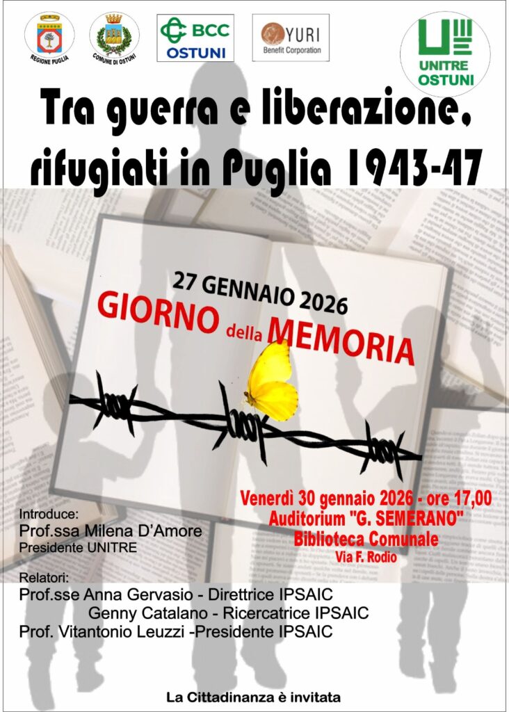 Domani 30 gennaio alle ore 17,00 presso la Biblioteca civica "G. Semerano" di Ostuni, in occasione del Giorno della memoria, si terrà l'evento